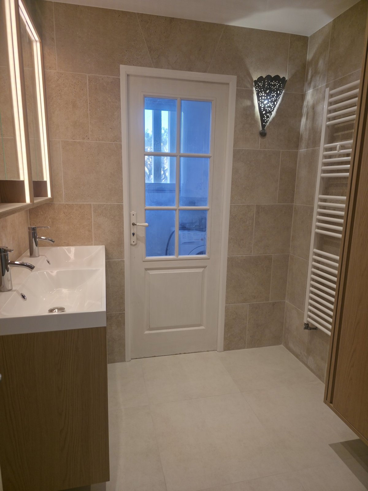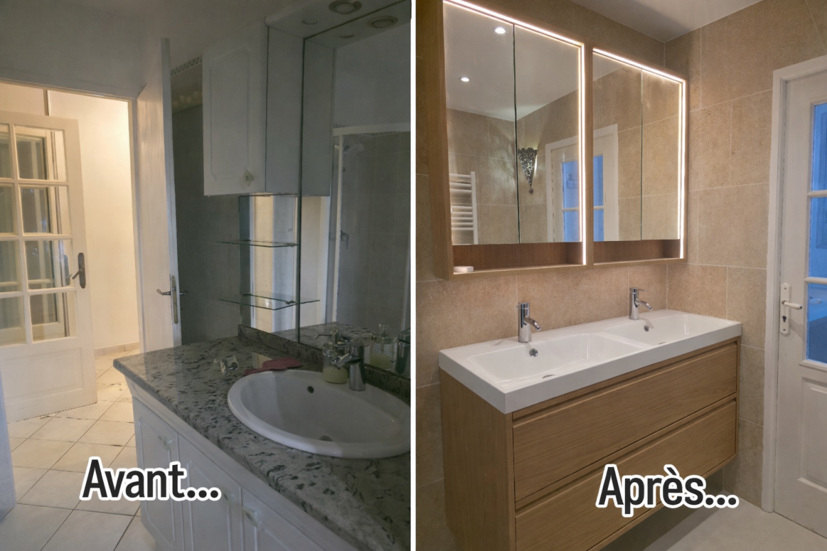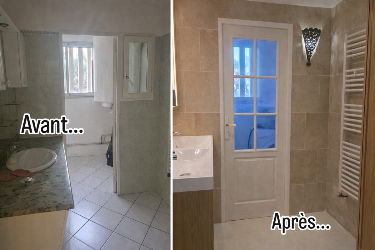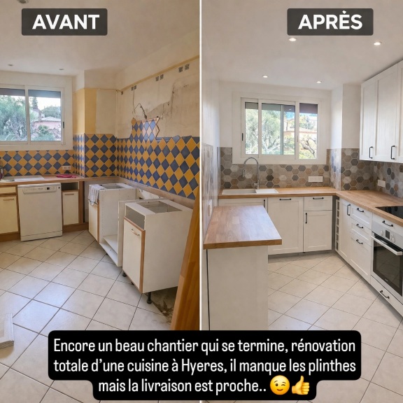 Chantier de rénovation à Hyeres, tout à été remplacé à part le carrelage, peinture, murs et plafonds, plomberie, mise en conformité de l'électricité, pose d'une cuisine IKEA et intégration de l'électroménager, un beau travail d'équipe.